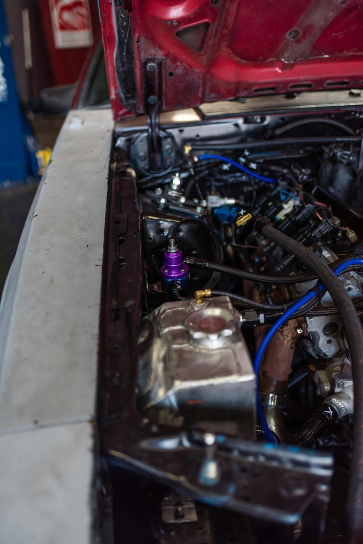 The Dream Team’s fuel system is comprised of a MagnaFuel 750 tuner fuel pump feeding the spec VP Racing Fuels C16 through a MagnaFuel regulator to a set of 80 lb/hr fuel injectors. To keep the engine running at optimum temperature, the gang bought a used water pump with a thermostat housing and tensioner for $250, along with a used water overflow tank they spent a paltry $20 for. The car does not have a radiator or transmission cooler.