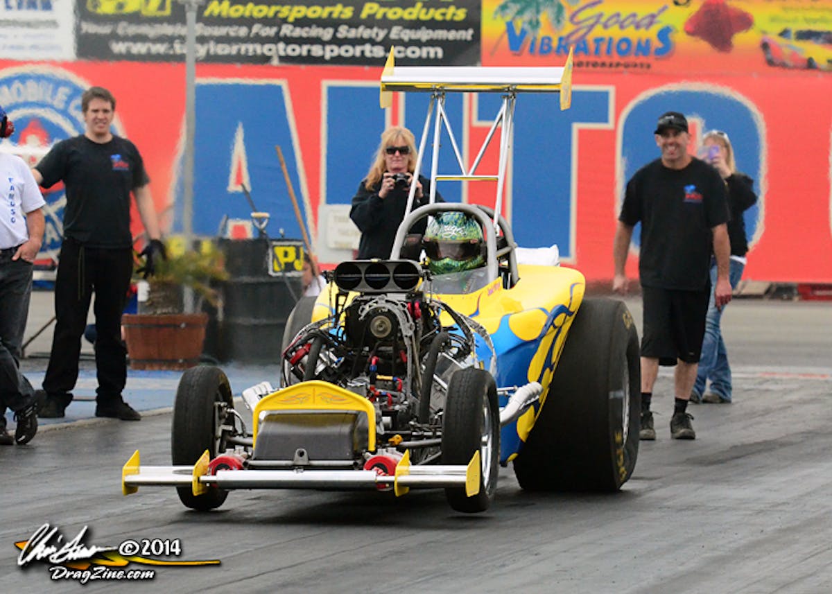 The 56th Annual Bakersfield March Meet is set to kick off March 6-9th at Auto Club Famoso Raceway in Bakersfield, California. A week ago, a handful of sportsman and nitro teams took advantage of an open test and tune day to get some laps in down the historic quarter mile. Two drivers were completing their required passes to earn their competition licenses, including Dusty Green in the “Circuit Breaker” Nostalgia Top Fuel Dragster and Matt Bynum, wheeling the “Bays & Rupert” Nitro Nostalgia Funny Car campaigned by the highly successful Jason Rupert.