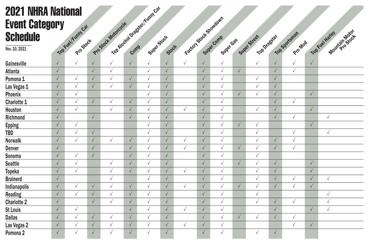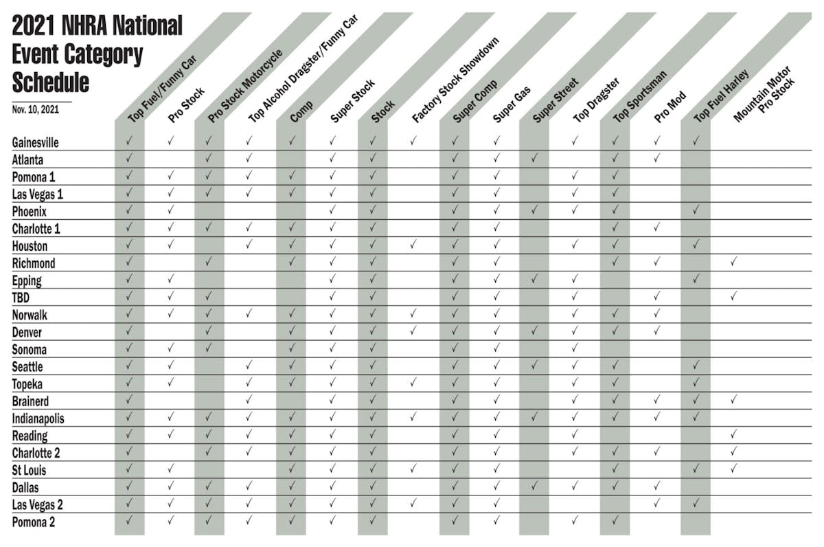 Teams in Top Fuel and Funny Car will compete at every 2021 NHRA Camping World Drag Racing Series event. Pro Stock, which celebrated its 50th year in 2020, will race at 18 events in 2021, returning to several venues, including Houston, Topeka, and Epping. The Pro Stock Motorcycle class will compete at 16 races next season, starting with its traditional opener in Gainesville and including races at Pomona and Las Vegas in April.