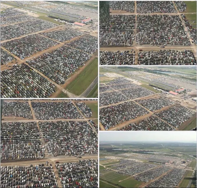 Over the Labor Day weekend, wreckers began arriving by the hundreds, turning the Royal Purple Raceway into one of the world’s largest parking lots— an estimated 10,000 vehicles were delivered by that Monday, and some sources said as many as 100,000 vehicles could eventually fill the areas usually reserved for drag racers and spectators.