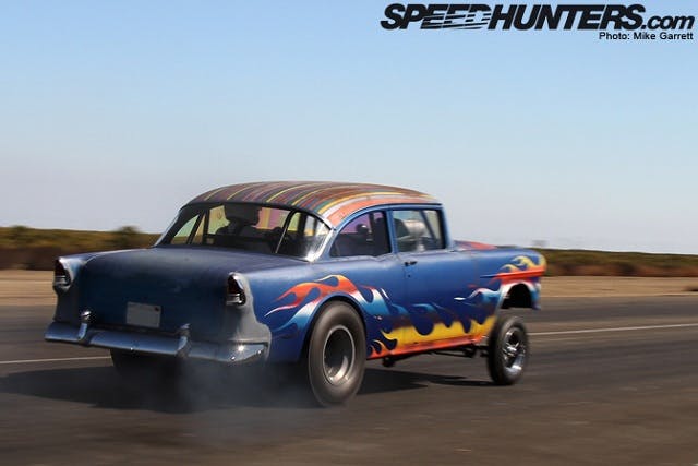 The earth was shaking in Dos Palos in California’s Central Valley at the 3rd Annual Hot Rod Gathering at Eagle Field.  Pre-73 cars from all over the state converged on a dusty 1/8 mile strip at this World War II era airfield. No lights or timing, just a wild flagman and that’s it. According to Speedhunters, it was about as bare bones and old school as drag racing gets.