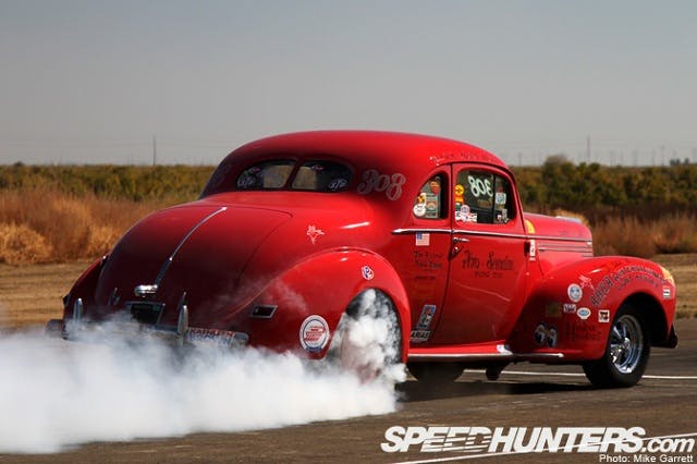 The earth was shaking in Dos Palos in California’s Central Valley at the 3rd Annual Hot Rod Gathering at Eagle Field.  Pre-73 cars from all over the state converged on a dusty 1/8 mile strip at this World War II era airfield. No lights or timing, just a wild flagman and that’s it. According to Speedhunters, it was about as bare bones and old school as drag racing gets.