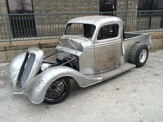 With a 23.3 chassis, four link brackets and a torque arm, this pickup truck is far from ordinary. Using multiple modern parts including C6 Corvette spindles with custom upper and lower a-arms built in house at 417 Motorsports and Strange brakes on all four corners. The bed of the truck was completely remodeled from aluminum with formed aluminum wheel tubs to tuck the 315 Drag Radials neatly in the Ford rear fender wells. The firewall was replaced along with the floor pans, both custom composed in-house out of metal.