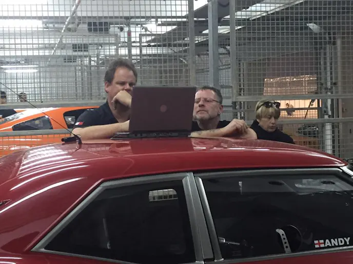 Andy (right) and Shane Tecklenburg poring over the data on the computer and getting RV3 ready for another lap. Tecklenburg has been instrumental in getting the team to Bahrain and in its on-track successes.