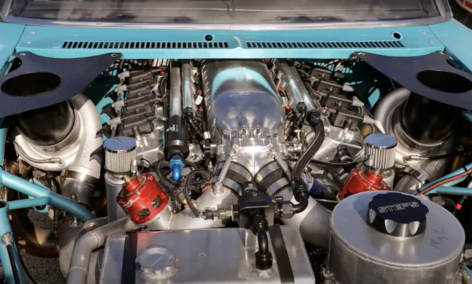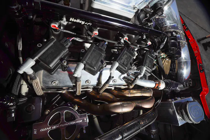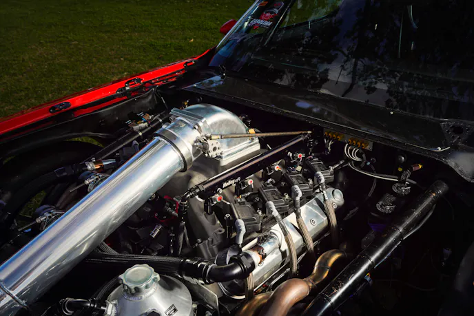 Spiess partnered with his longtime Pro Stock engine builder, Jon Kaase, a specialist in big-inch Ford engines like those used in mountain motor Pro Stock racing, to outfit the car with the kind of power needed to run in the 6-second zone in full street-legal trim. Kaase assembled one of his Boss Nine engines, a replica of the famed Boss 429, which measures out to 565 cubic-inches and uses his own cylinder head design. The paired it with two Precision 88mm turbochargers to produce what Spiess said, at full song, should be around 3,000 horsepower.