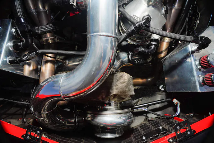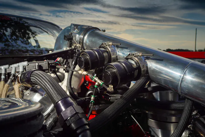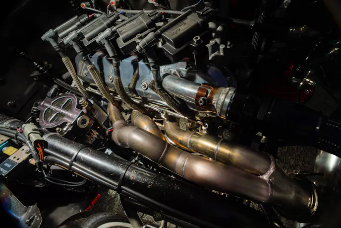 Spiess partnered with his longtime Pro Stock engine builder, Jon Kaase, a specialist in big-inch Ford engines like those used in mountain motor Pro Stock racing, to outfit the car with the kind of power needed to run in the 6-second zone in full street-legal trim. Kaase assembled one of his Boss Nine engines, a replica of the famed Boss 429, which measures out to 565 cubic-inches and uses his own cylinder head design. The paired it with two Precision 88mm turbochargers to produce what Spiess said, at full song, should be around 3,000 horsepower.