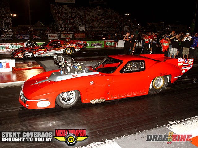 Spiro Pappas Vs. Billy Glidden, Pappas and Glidden finally faced each other in the semi's after an all day battle, but bad luck would strike Pappas and he had a -0.005 Red Light against Glidden giving Glidden the automatic win, and a trip to the finals. Glidden ran a 0.359 RT 4.115 @ 181.89 Michelle Wilson had the bye run in the semi's, but after about 60' Wilson got badly out of shape, but quickly let out and got the car under control and costed to the finish line.