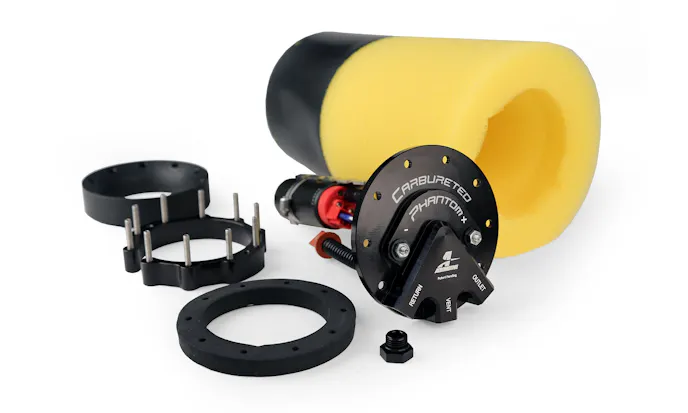 Aeromotive, the market leader in fuel delivery systems, is proud to announce its new, high performance Phantom Returnless EFI fuel pump and baffle system. The Phantom Returnless has a built in by-pass valve set for 58-PSI of line pressure, eliminating the need for an external regulator and return line from the engine. The all-in-one Phantom fuel system adapts to any fuel tank from 6- 11” in depth and includes the patented Phantom foam and bladder baffle to maintain fuel flow and pressure even when the tank is low on fuel.