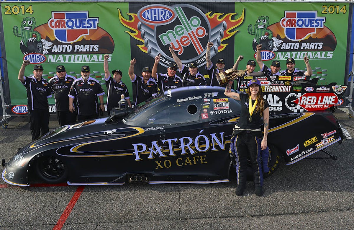 Alexis DeJoria picked up her first ever win in the Funny Car category today at the 30th annual CARQUEST Auto Parts NHRA Nationals. DeJoria, driver of the Kalitta Motorsports Patrón XO Cafe Toyota Camry Funny Car defeated veteran Champion driver Robert Hight, 16-time World Champion John Force, former crew chief, teammate, and 2012 Top Fuel World Champion Del Worsham, and former teammate Jeff Arend en route to her first win. All this on the heels of her history making run at the race prior in Pomona, Calif. when she became the first woman ever to make a sub-four second run [3.997-seconds]. To say DeJoria and the Tommy DeLago/Glen Huszar-led team would be starting off the 2014 NHRA Mello Yello Series on a good note would be an understatement.