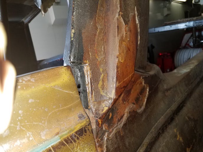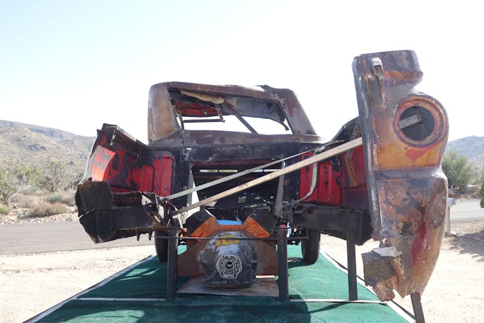 It, of course, is a bit worse for wear — the truck tumbled end-over-end numerous times at high speed in the accident, sparing Golden’s life but rendering it unrepairable. Built in unibody fashion, the mangled left rear fender was cut away, meaning the rearend could no longer be bolted into it. What remains is the crushed cab and the relatively unscathed passenger side flanks.