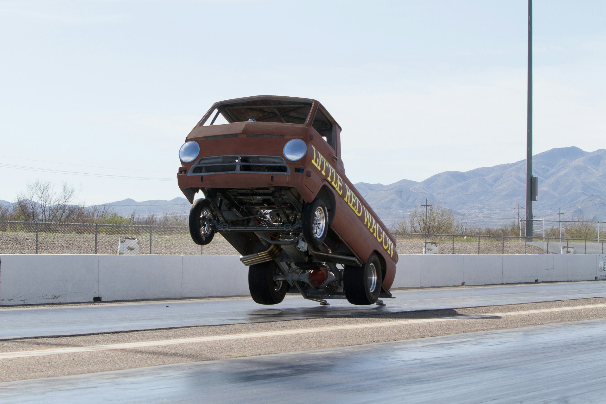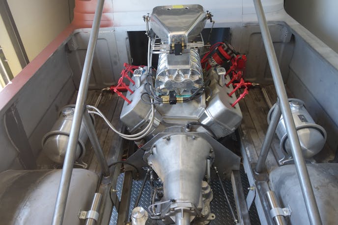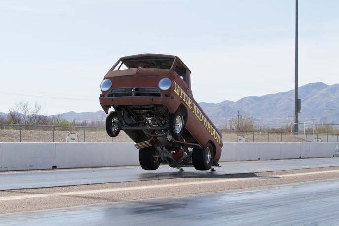 Mantel is behind the wheel in these photos taken at Tucson Dragway and becomes the only driver to pilot both the Little Red Wagon and the Hemi Under Glass. Will there be a new generation Little Red Wagon in the future? “We already have the Little Red Fire Truck wheelstander. It’s a Hemi-powered Dodge Ram. Kids and adults love it and that’s what we’re doing for now.” The new Little Red Wagon, a 1965 A-100, will now go in for body work and several coats of Candy Apple Red — the color it’s best known for.