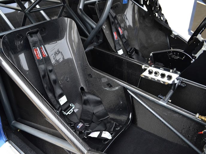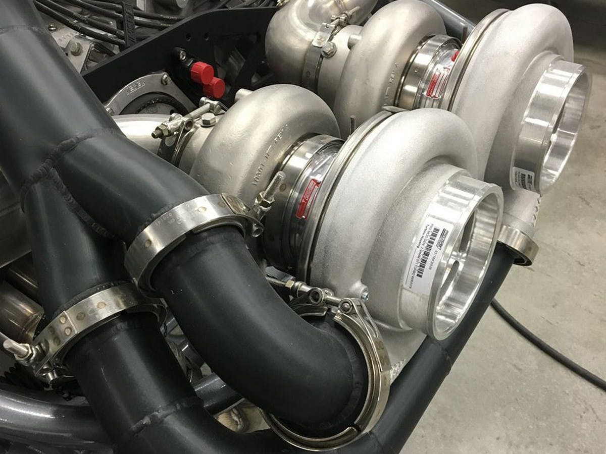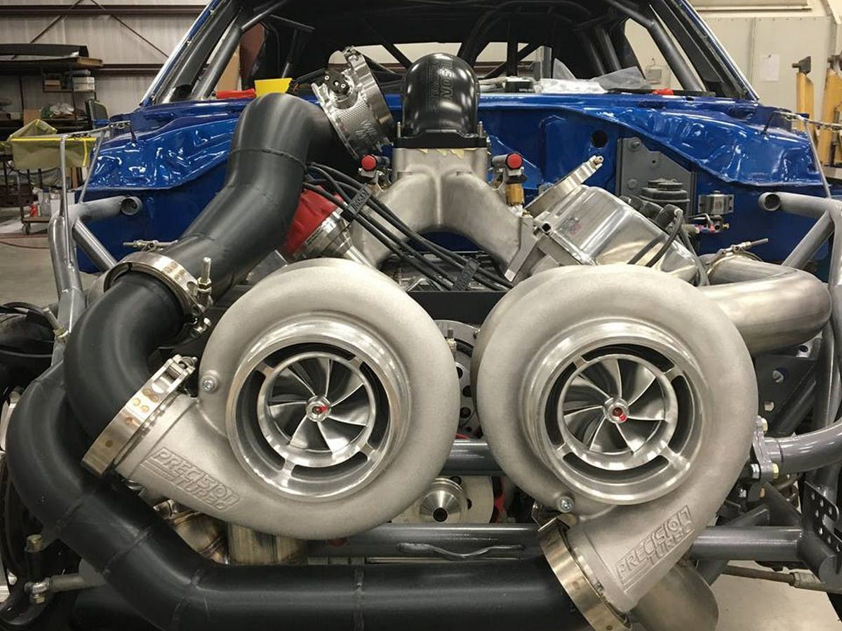 To take advantage of the new lower race weight, the undisclosed engine combination received some extra boost. Gone was the single turbo setup, and in its place a new turbo system that features a pair of 94 mm Precision snails to make power.