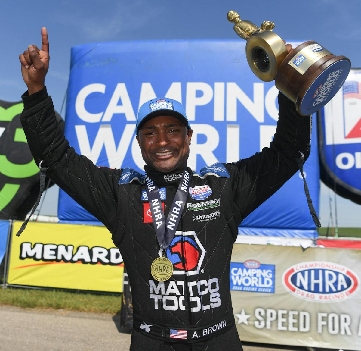 Antron Brown scored his long-awaited first win as an NHRA team owner on Sunday at the Menards NHRA Nationals presented by PetArmor at Heartland Motorsports Park in Topeka, Kansas. It was his 53rd Top Fuel triumph, and 69th national event win overall.