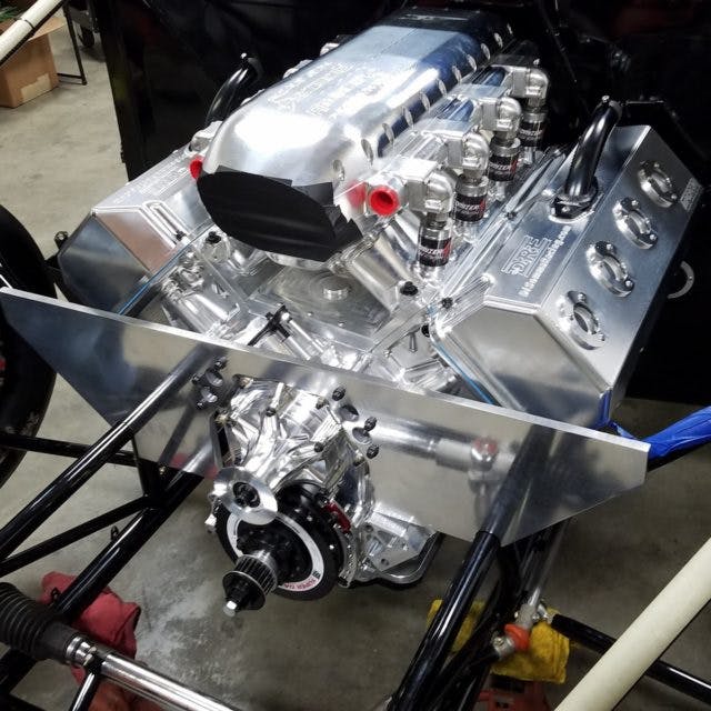 The Straightline chassis will be using Menscer Motorsports shocks in the rear to help put the power down to the Strange Engineering full floater rearend, while a set of Santhuff struts will be used in the front. A PST carbon fiber drive shaft with billet yokes will transfer the power from the Proformance Racing Transmissions transmission and Neal Chance Racing Converters billet torque converter. WELD wheels in the rear that will be wrapped in Mickey Thompson rubber will put all the power to the ground.