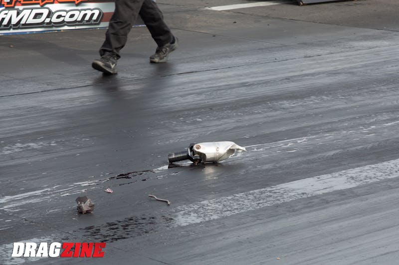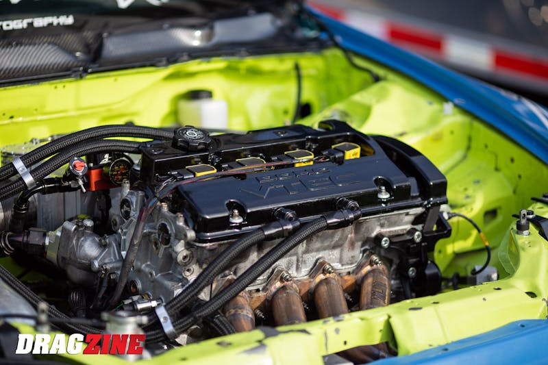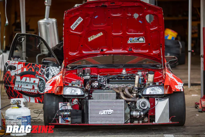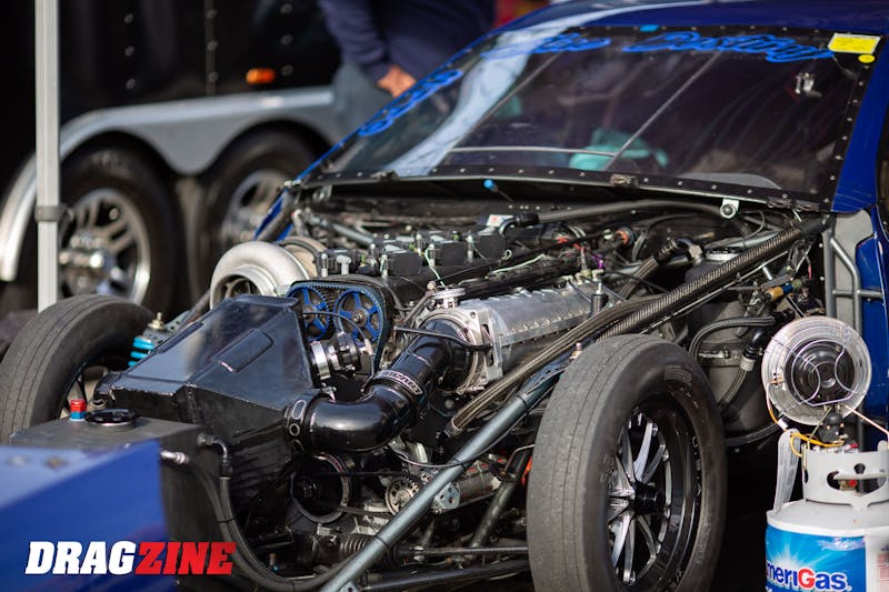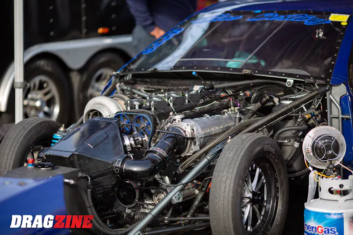 Steele’s Xiled Drag Cars-built Mustang is powered by a stout Coyote engine from TKM Performance. The engine uses a set of OEM Ford cylinder heads that have been worked over, along with a Plazmaman intake to feed the boosted air into the engine from a pair of Forced Inductions 76mm turbos. Steele’s transmission of choice is from Tick Performance, and it has been paired with a clutch from Advanced Clutches. A Fab-9 rearend has the unenviable task of transferring all that horsepower to a set of Mickey Thompson tires each time Steele mashes the loud pedal.