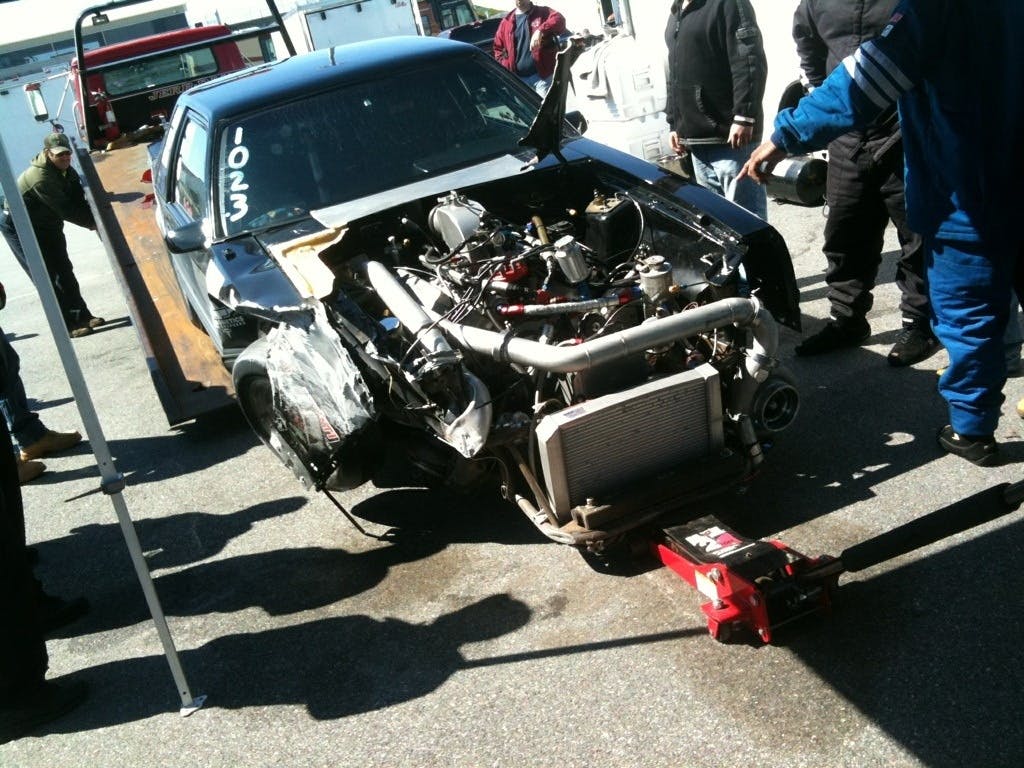 Dwayne has informed us that the cause of the accident was a blown head gasket which pushed water out and under the tires sending him head on into the wall.