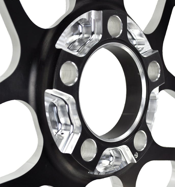 The forged 6061 T-6 wheel centers sport a popular black hard anodized finish, providing a race-styled, contrasted look to set off any vehicle that’s “pretty bulletproof for anything that customers might clean their wheels with,” as Sandoval points out. The centers will be mated to spun aluminum rims.
