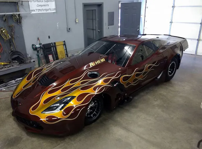 This one of a kind carbon fiber C7 body is comprised of panels from Skinny Kid Race Cars and remains within factory specs. The nose of the car is also a custom piece designed to look more like factory than the typical stretched version you’d see on a Pro Modified car. For paint and body, the Copson’s shipped the car over to Bucky’s LTD in Martinsburg, West Virginia, where Travis “Tuki” Hess, wrapped up the paint job with some flames to really set the look of this car apart.