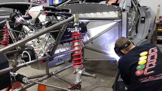 Once the chassis work was complete, they wedged a 521 cubic-inch ProLine Racing Engines Hemi between the framerails and Naughton built the custom headers and plumbing for the twin-turbo setup. In order to fit rules for both classes Blake wants to run, he will be changing out the turbos from a pair of 106mm Garrett turbos for Radial vs The World racing, to a set of 98mm Garrett’s for NMCA’s Radial Wars. Both sets of turbos are supplied by Turbos Direct in Arizona. Fuel Tech’s FT600 is onboard and tuned by Jamie Miller. Behind the PLR Hemi mill is a two-speed M&M Transmission with a ProTorque EV1 lock-up converter.