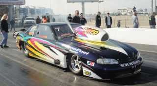 Crew Chief Woodard said we have spent countless hours studying chassis dynamics for this project and days at a time on the garage floor with a tape measure and calculator. Our 1995 model chassis has now undergone a complete transformation with additional bracing, a 180 degree turn in the scaling, and changes in the four link set up. During the process a crack was also located. Woodard said this is the second time a crack has been discovered just following difficulties with getting the car to respond correctly and may have been contributing to the problem. Crack inspections have become a more frequent part of our routine. Preliminary testing is showing we are headed in the right direction with a rough but encouraging 1.01 60ft. time. We should be ready by May to give the competition a good run. We feel this new set up has the potential to compete in the low 6 second range now needed on the West Coast.