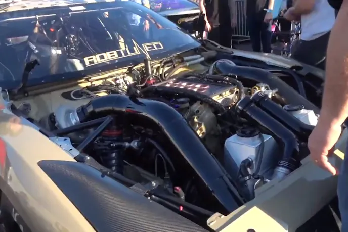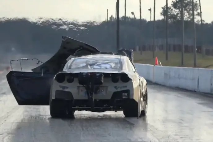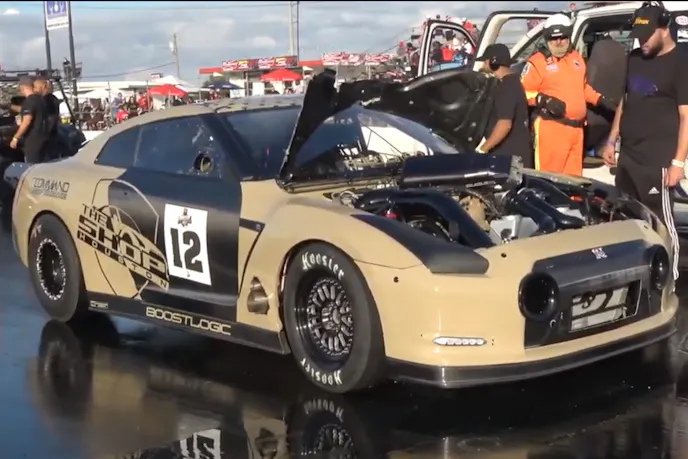 In this video from ImportRace, we see Brosnan put Kimbo on the chip and take off on what seems like a solid run until there’s an audible bang and the hood begins to flop around on the front of the car. Things go from bad to worse as a fire breaks out in the engine compartment with Brosnan still in the car. After a few frantic seconds, Brosnan emerges from the GTR as the Bradenton Motorsports safety crew arrives to put out the flames. The damage from the intake failure was extensive, but thankfully Brosnan wasn’t hurt and Kimbo will live to fight another day.