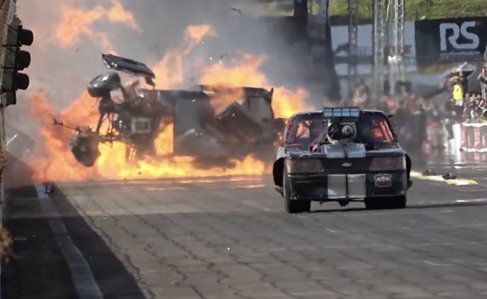 Moreira was racing his wild, all-wheel-drive, screw-supercharged Chevrolet Nova against Josemar Hudema and his likewise all-wheel-drive Opala, when he suffered tire shake and lost control of the machine just beyond half track. Moreira slammed into the concrete guardrail and metal fencing, the car shedding parts and pieces and erupting into a fireball as the car rolled and spun to a stop in the middle of the racetrack. Despite the major impact and ensuing flames that engulfed the cockpit, Moreira climbed from the car under his own power. He was checked out by medical personnel and suffered only what were reported to be minor injuries.