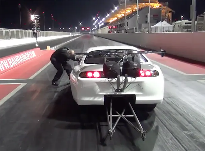 American driver Gary White and the Ebrahim Kanoo-led team have made history today at the Bahrain International Circuit, recording the first five-second pass ever by an import-powered vehicle with a blast of 5.97-seconds at 387 Km/h (240 miles per hour) with their turbocharged Toyota Supra.