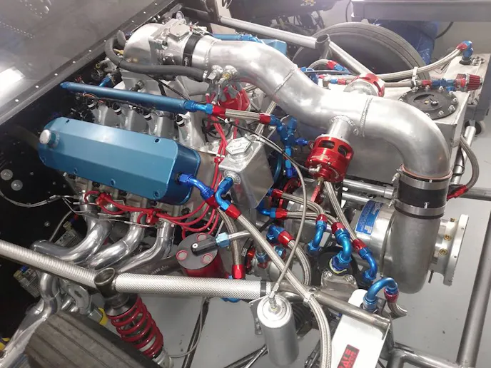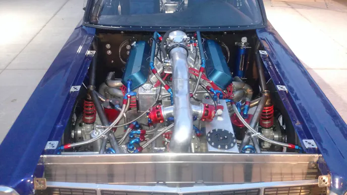 To keep some people guessing, Brett says the car made over 1,500 horsepower on the chassis dyno before the straps let loose. “The engine is all-Ford, top to bottom. It’s a 638-inch big-block Ford with C-Ford cylinder heads done by Charlie Evans, and an F3 ProCharger. We use a BigStuff3 and a Racepak.”