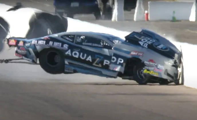 Sitting outside the qualified field, Caruso was on a single run in Saturday’s final qualifier, when her car drifted out of the groove early, forcing her to lift. Caruso motored on down the track, crossing the stripe at a slowing 142 mph, when the driveline in her Camaro appeared to inadvertently lock up, causing it to turn hard into the left lane retaining wall, before careening across the shutdown area and striking the opposing wall with similar force.