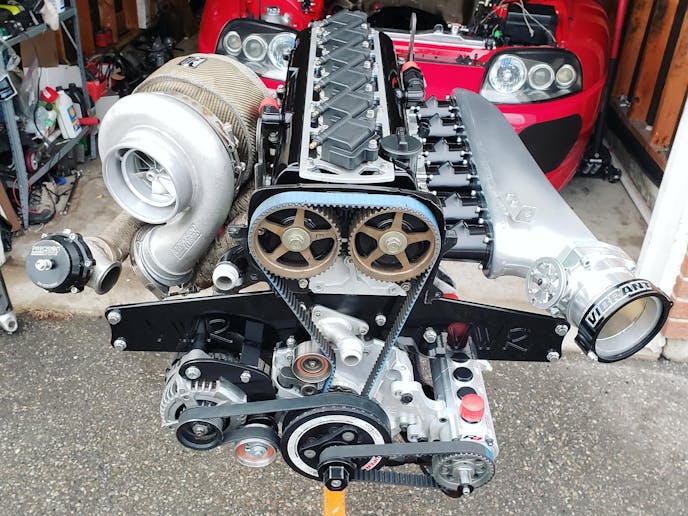After importing the Supra from Japan in 2012, Sammut began the journey of taking the car from a stock 310 horsepower car to a 1,500 horsepower machine that has run as quick as 7.68 at 183 MPH. Sammut has built the car in his one-car garage at home and upgraded most of it himself. Under the hood is a 2JZ block filled with great parts and topped off with a Headgames Motorworks cylinder head. Providing boost is a Precision 8685 turbo that funnels air into a Hypertune intake manifold. Behind the engine is a Rossler XHD TH400 transmission and ProTorque bolt-together torque converter.