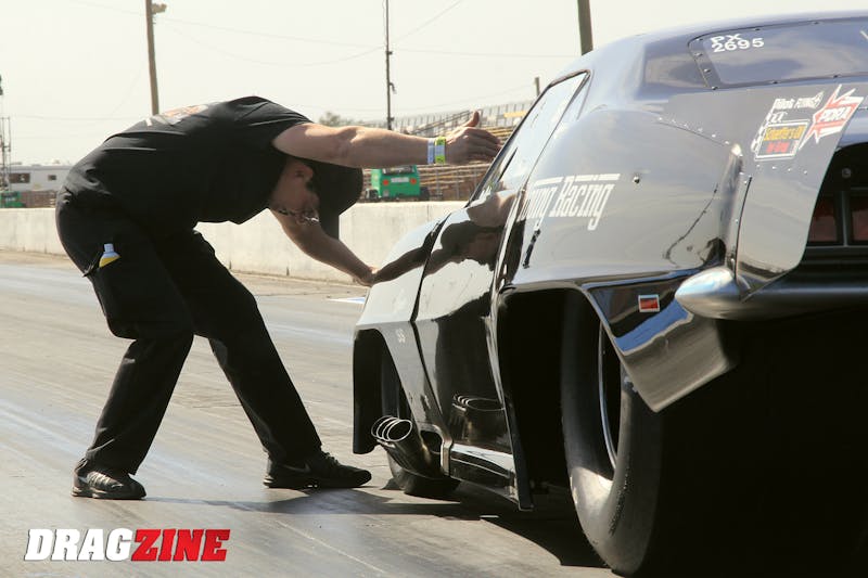 “After I got bored with the 10.3 passes, I totally cut everything out of the car except the rear back half. From there, I built a 25.4 spec chassis in the garage of my parent’s house and upgraded the front suspension to a Mustang two coil over style suspension. The new motor is a 455 cubic-inch small block Ford with a single fogger that’s backed by a powerglide,” Martin explains.