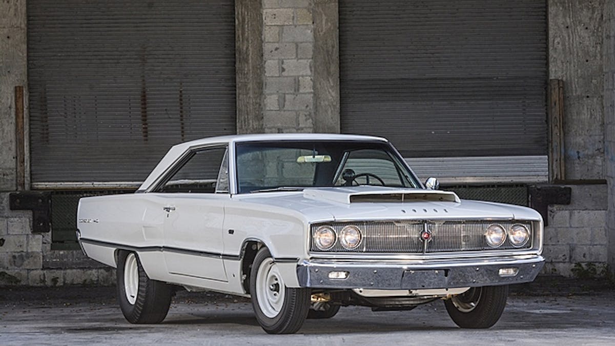 Fifty-five Lightweight B-body Coronet’s like this one were rolled out by Dodge in 1967 for an all-out effort in the Super Stock/B category, with a complete racing-specific package throughout and a 426 Hemi under the hood. Carrying the code “WO23” (the Plymouth Belvedere version carried an “RO23” code), the cars were stripped of their emblems — save for the HEMI badges on the fenders — along with the hubcaps, the radio, heater, weather stripping, spare tires and jack, windshield wipers, floor mats, and even lacked all of the sound insulation and body sealer. Even the front sway bar, deemed redundant by engineers, was deleted from the racking package. The folks at Chrysler wanted these to be the class of the field, and whatever it took to make them light and quick, they did.
