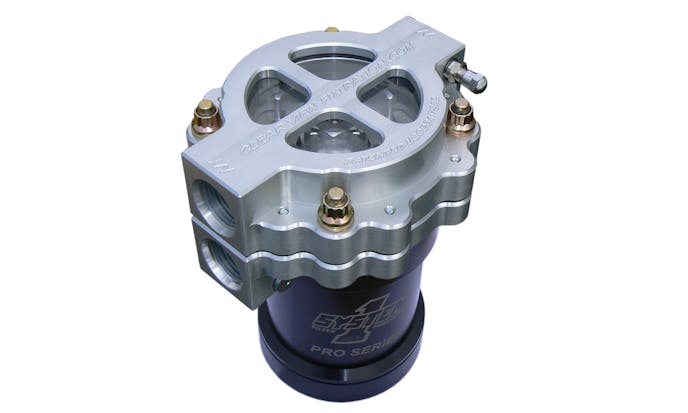 Clear View oil filters feature a clear or black anodized, 6061-T6 billet aluminum housing and 1/2 inch thick clear polycarbonate sight windows. The stainless steel mesh filter elements are available in 60- and 150-micron versions that can be cleaned and reused. The filter assemblies are rated to 150 psi maximum pressure and 200 degrees F maximum temperature. Four inch diameter assemblies have two inlet and outlet ports for -12 AN fittings; the six inch diameter assemblies come with -12 or -16 AN inlet/outlet ports.