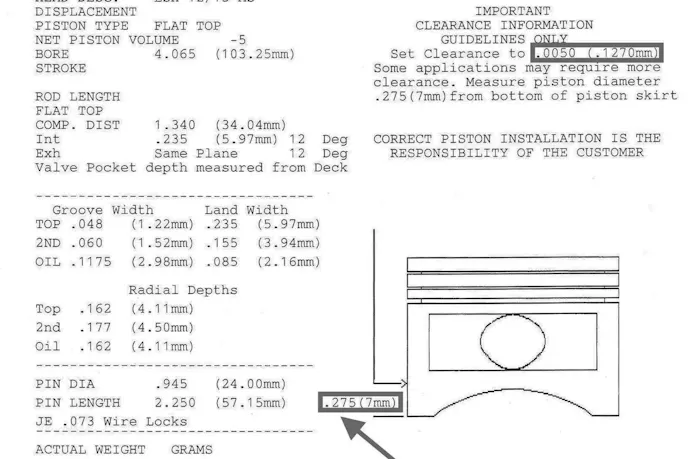 All pistons are not perfectly round; in fact, they are described as the diameter being a “cam” shape. By following the specific “gauge point” locations that JE Pistons carefully points out in its illustrated instructions, you will achieve the proper measurements to match your cylinder bore and derive appropriate piston-to-wall clearances.