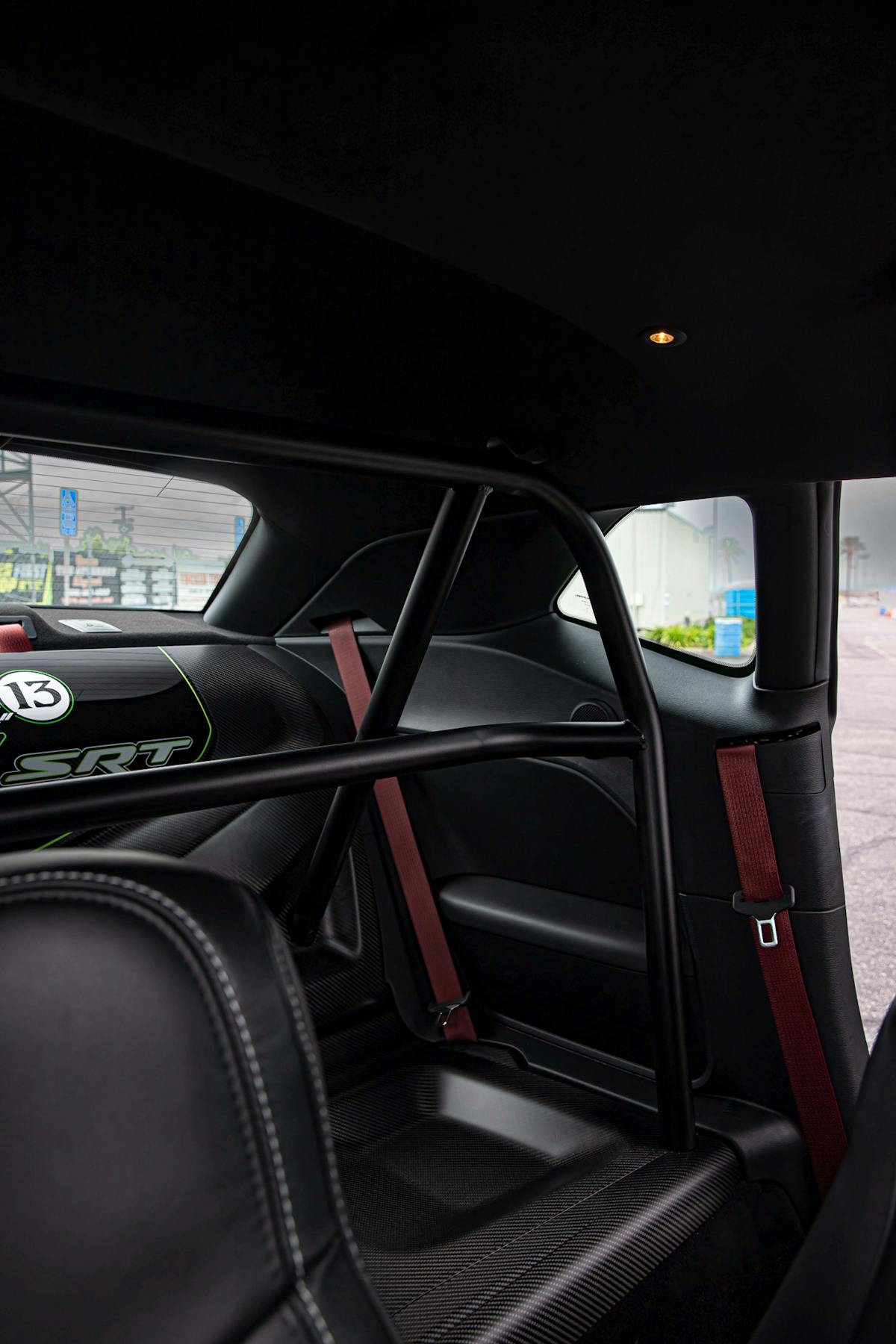 The installation of Direct Connection Rear Seat Delete Carbon-Fiber Closeout Panels served to enhance both the weight distribution and visual appeal of Dunham’s vehicle, accentuated by custom Demon artwork meticulously applied by Salvaggio.