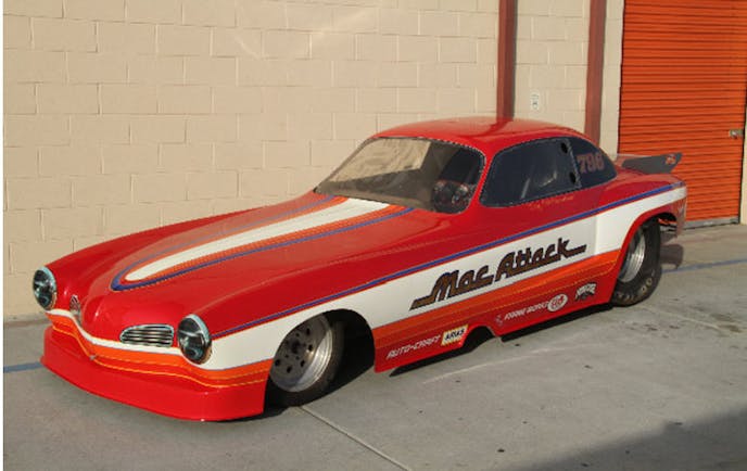 The car, being sold as a roller with the engine (with it turbocharger, injection, and exhaust but in need of a refreshen) available separately, has a two-speed Powerglide transmission, a pair of converters, the driveshaft, and a Keith Longerot-built rear end housing installed or included. The body itself, carrying the familiar “Mac Attack” logo seen on the early family-owned Top Fueler, is a truly one-off piece housed around what is, likewise, a one-off race car.