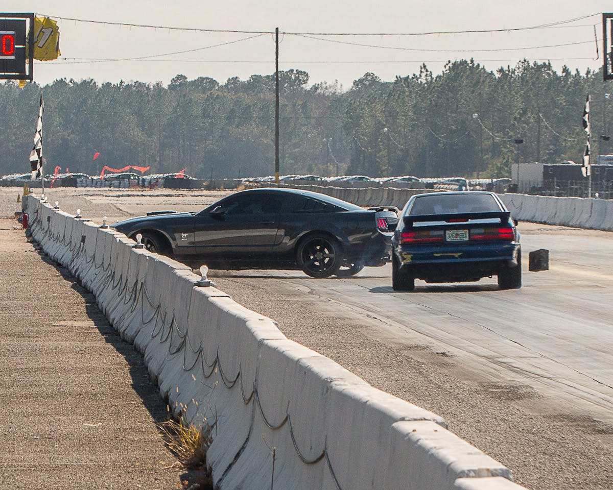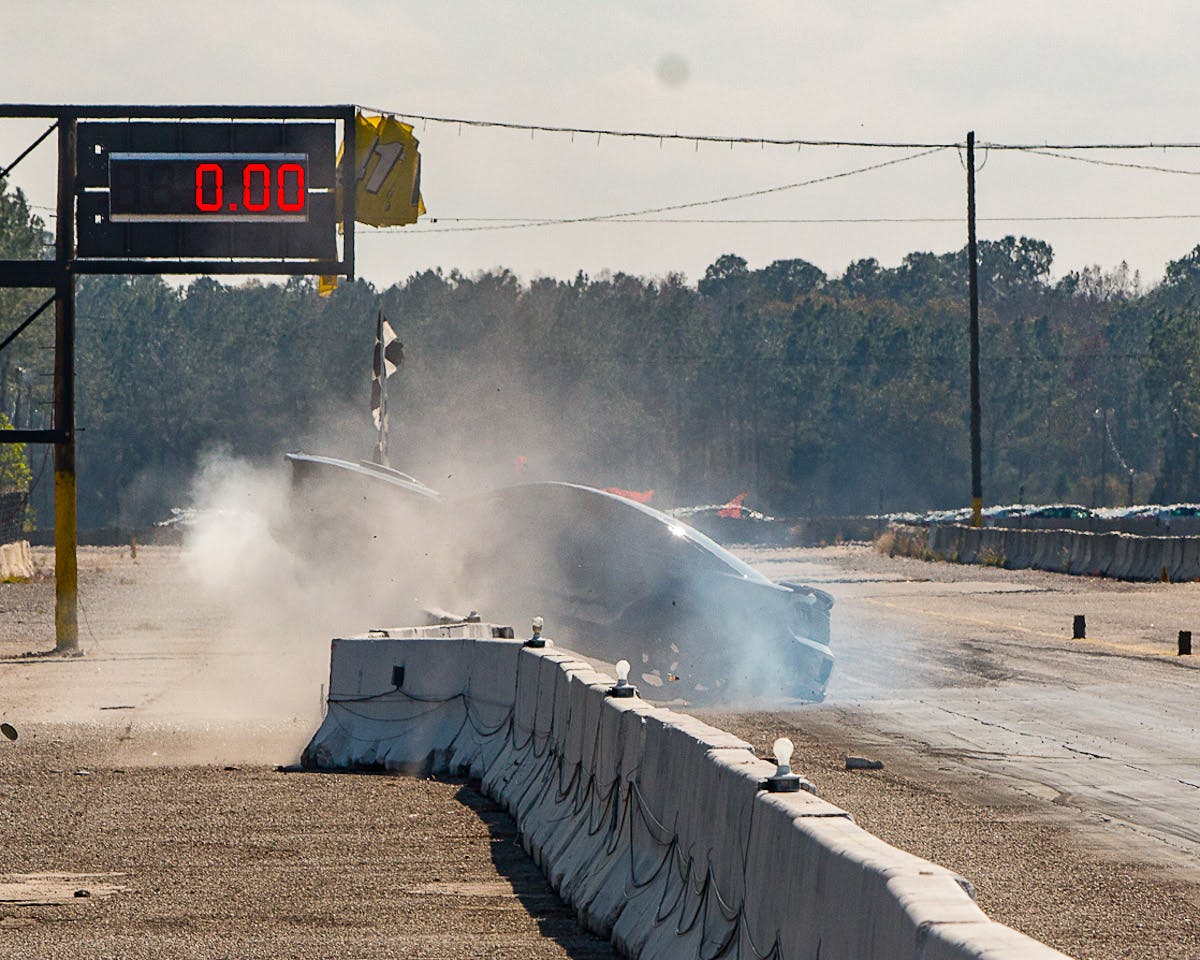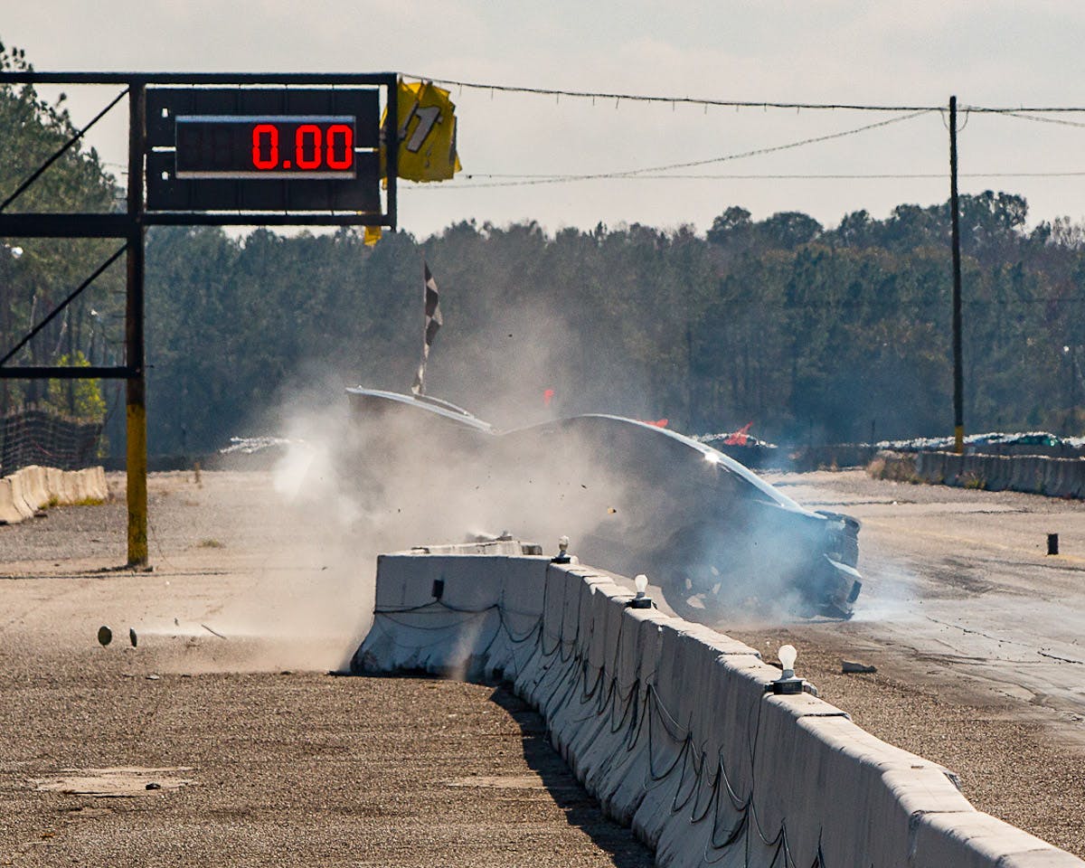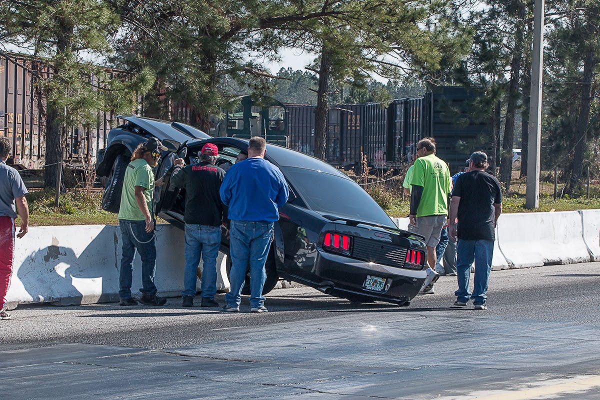 Eppolito was making a test-and-tune pass on Sunday afternoon at the strip south of Jacksonville when he lost control around the 300-foot mark and crossed the centerline directly in front of another Mustang running in the opposing lane. His car struck the wall at nearly a head-on angle, shoving the concrete barrier back several feet and catapulting the car partially up and over. As you can see in the images, the car slid several car lengths down the top of the barriers, in the process tearing the exhaust system and other components from the undercarriage loose.