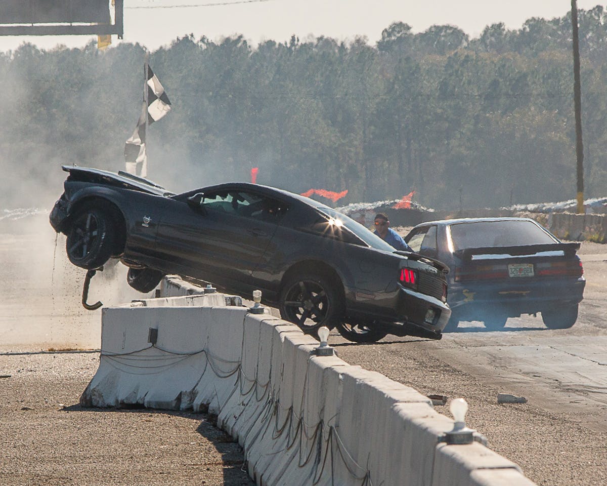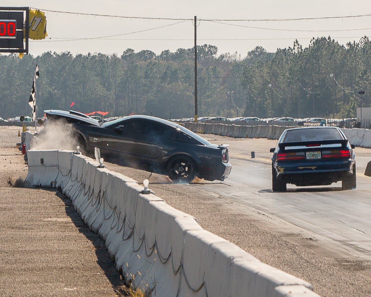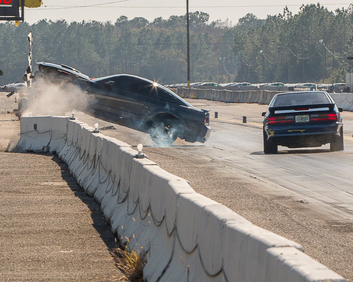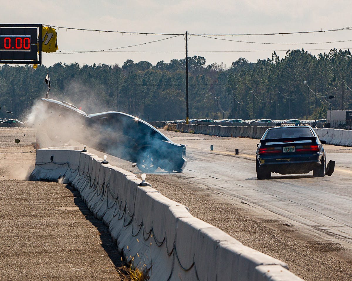 Ace lensman Doug Freeman captured this wild sequence at Florida’s Green Cove Dragway in Green Cove Springs as Middleburg native Vince Eppolito lost control of his 2009 Ford Mustang and crashed into — and eventually on top of — the concrete guardrail.