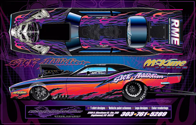 In conjunction with friend Steve Haugen, Daniel designed the eye-catching new paint scheme, which will continue to carry the “Sick Addiction” namesake found on his previous race cars. The car is going to be wrapped to finish out the year, and will then go into the paint booth to have the theme permanently applied to the flanks of the Poncho.