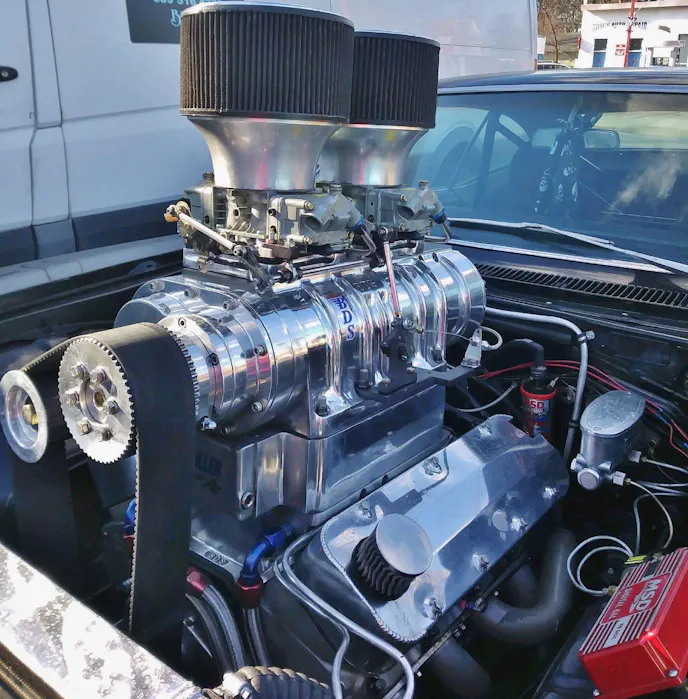 An 8.0:1 compression, 555 cubic-inch Merlin 3 block became the base of this build with a Howard’s hydraulic roots blower camshaft and a set of ported and polished aluminum Edelbrock heads. The BDS 16-71 roots blower makes eight pounds of boost and is topped off with a pair of 990cfm Chuck Nyuten carburetors. An MSD distributor and digital 6AL ignition box control the spark which is met with 93 octane pump gas.