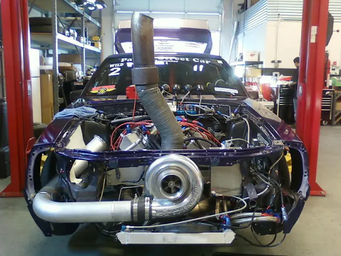 When we found this photo posted at Yellow Bullet, our first though was this fella’ must have entirely too much free time on his hands. What we have here is David Schwarz’s Wild Street 1988 Ford Mustang with a massive exhaust stack attached to his 98mm Turbonetics hair dryer that’s not only poking through the hood, but appears to stand above the roof of the car as well.