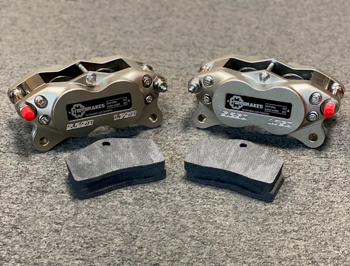 TBM does not manufacture its own carbon-carbon-fiber rotor, but does supply the pads to go with its kits. The kit includes the calipers, pads, and the mounting hardware to work on any of the three above-mention strut styles.