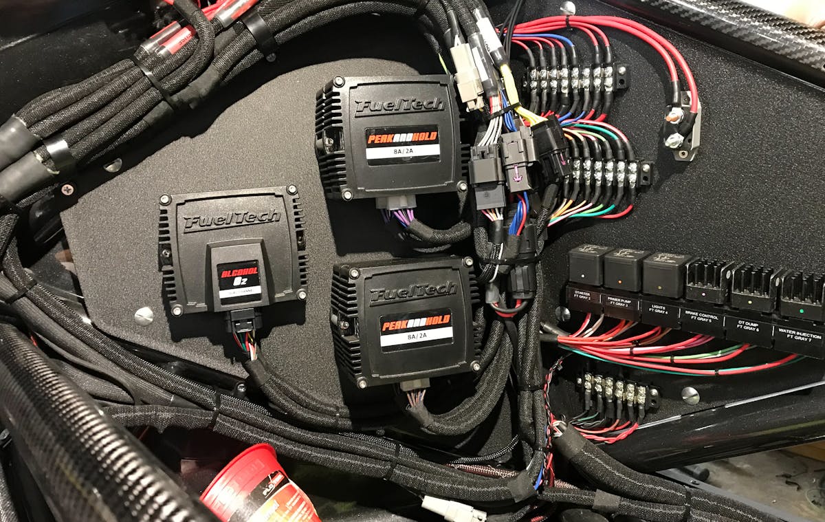 Dillard located a former Jerry Bickel Race Cars-built Camaro that Johnny Cobb had briefly campaigned in Pro Extreme with a supercharged Hemi for power. A deal he couldn’t refuse was presented and six months ago the car was acquired. With a number of supporters — ProCharger, FuelTech, and Mark Micke at M&M Transmissions, to name a few — 100-percent behind the project, Pro Line moved forward with the car, assembling an all-billet Hemi to power it. They waited in line at RK Racecraft, like any other customer, to have it wired and final-prepared. The first FuelTech Total Control build Pro Line has completed, it features the entire compliment of FuelTech systems — the FT600 ECU, FTSpark and coil-near-plug setup — with engine control and monitoring, ignition, fuel injection, traction control and power management, and data acquisition all handled directly by FuelTech.