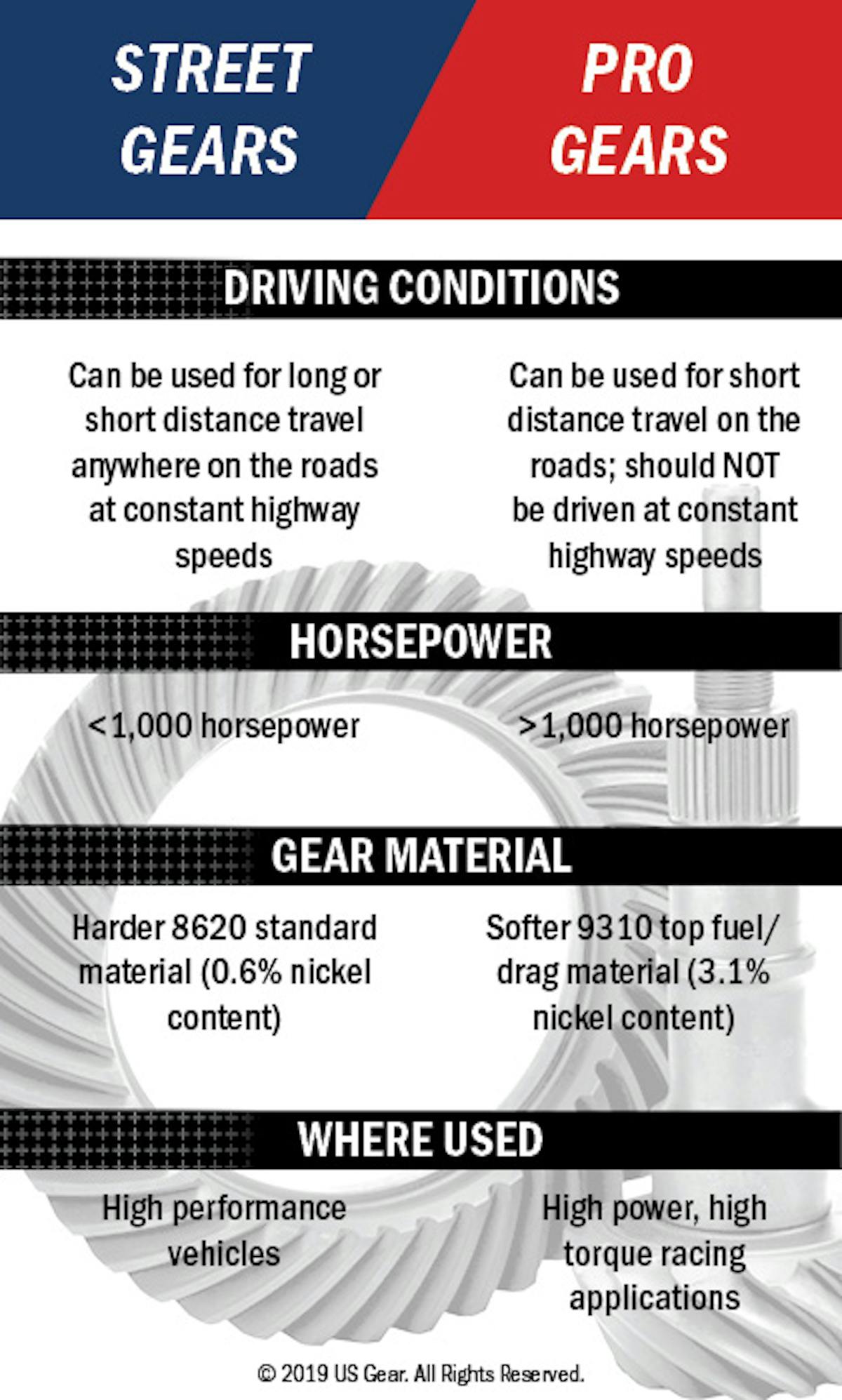 But if you’re exceeding 1,000 horsepower, or you’re splitting time between aggressive use at the strip and the roadway, a Competition gear, or Pro gear, is the better choice. Pro gears are made from a 9310 grade steel, which has a higher nickel content. The softer alloy is designed to flex and absorb shock loads of high torque, high impact drag racing. Due to their design, Pro gears would break down prematurely when used frequently on the street, leading to driveline failure.