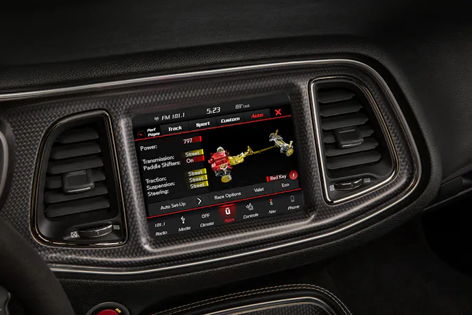 The drive mode settings on the Challenger SRT Super Stock include Auto (Street) mode, which sets the Bilstein ADS for comfortable ride with compliant handling, Sport mode, Track mode and Custom mode, which lets the driver select between Auto, Sport and Track mode configurations for the transmission, paddle shifters, traction, suspension and steering.