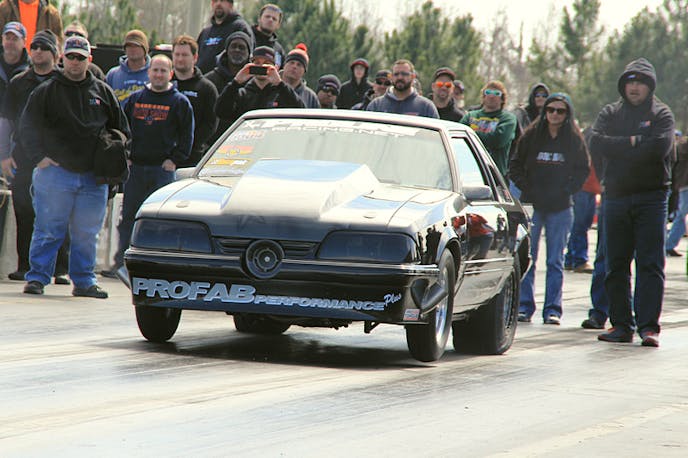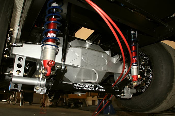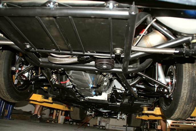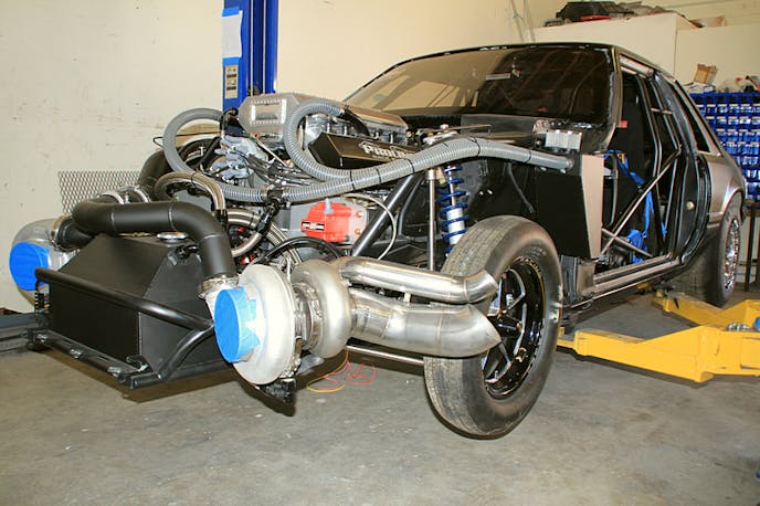A PST carbon drive shaft transfers the power back to a Racecraft Inc. rear housing filled with Moser internals. Strange Engineering drag brakes handle the stopping with Weld Racing wheels wrapped in Mickey Thompson rubber all around. Santhuff shocks and struts control suspension movement.