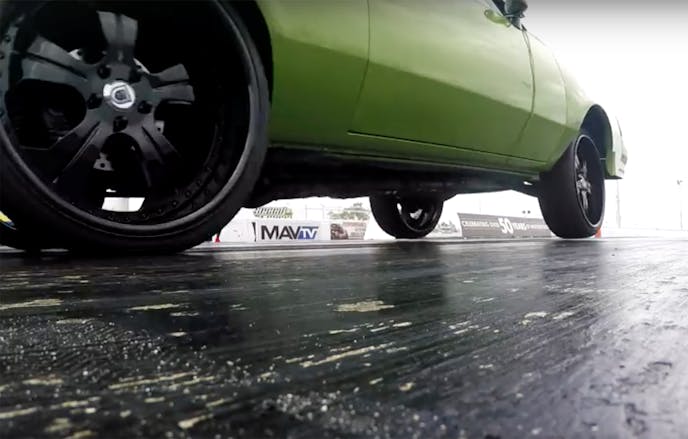 Videographer Justin Malcom also captured some footage of a dead-serious Buick Regal owned by Ozzy Acosta, that’s got a 383 stroker on nitrous for power, producing in the neighborhood of 700 horsepower — enough to lift its 22-inch front wheels right off the pavement. If you look close, you can spot an ever-so-slight degree of tire wrinkle in the sidewall on Acosta’s rubber band-like tires at the hit.