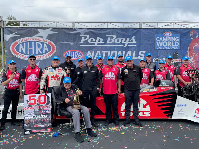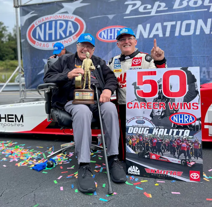 Doug, with his milestone win, became just the 23rd driver to achieve 50 national event victories, and the 16th in a professional category. A part of the famed Kalitta drag racing family, Doug departed a successful career in open-wheel racing to join the Top Fuel ranks in 1998. His first win came that year at Sonoma. He won his 10th at the fall Chicago event in 2005 and his 25th at Bristol in 2006. But it took a frustrated Kalitta two races shy of three years — his last came at St. Louis in 2020 — to get the 50th. Doug had won Reading just one time, all the way back in 2002.