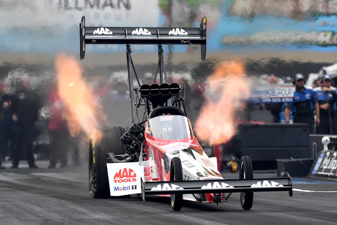 Doug was the No. 3 qualifier, his 10th top-four qualifying effort of the season, but that wasn’t the real story. During the Friday evening session, Kalitta raced to a 3.696-second elapsed time at 331.45 mph for his best qualifying attempt. As the Mac Tools dragster completed its 3.748-second qualifying run at 332.10 mph in the final qualifying session Saturday afternoon, the right-rear tire shredded, damaging the rear wing and the chassis, forcing the team to run its backup car for final eliminations. The Mac Tools team, with help from the Kalitta Air Careers team, worked late into Saturday night to prepare the backup car. Unlike the primary car, the backup car does not have a canopy, so Kalitta drove the car with an open cockpit for the first time this season.