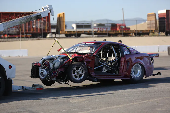 From the initial hit you could hear that Sikora was hazing the tires down the track, though kept it mostly straight. Though, right after the eighth mile cones, Sikora made hard contact with the left side wall and then shot across the track and made even harder contact with the right side wall. The Mustang has definitely seen better days but the important part was that Sikora walked away unharmed.